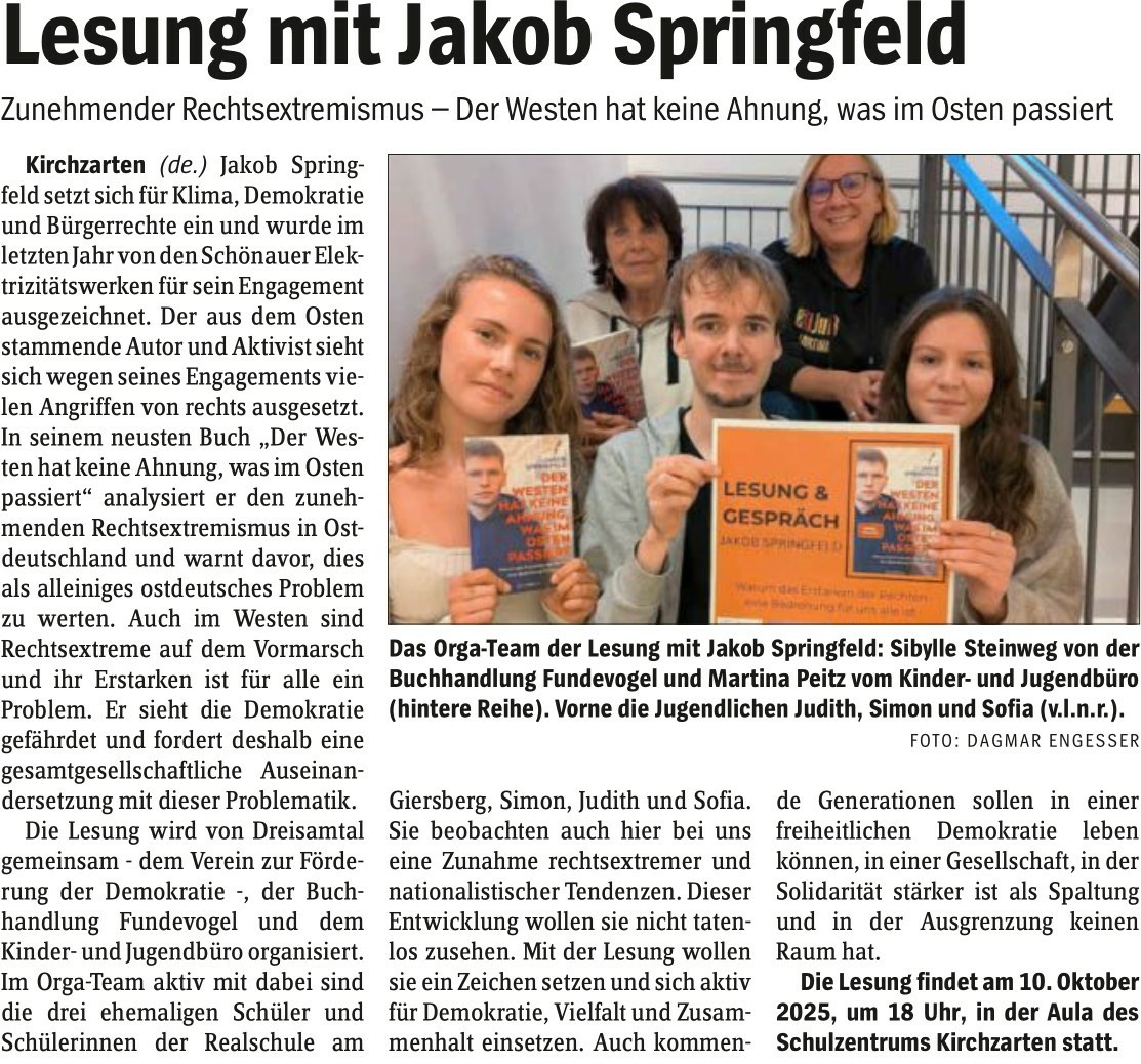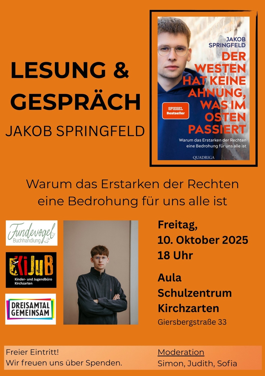 Deshalb haben wir für Freitag, 10.10.25 den Schriftsteller und Demokratieaktivisten Jakob Springfeld eingeladen.
