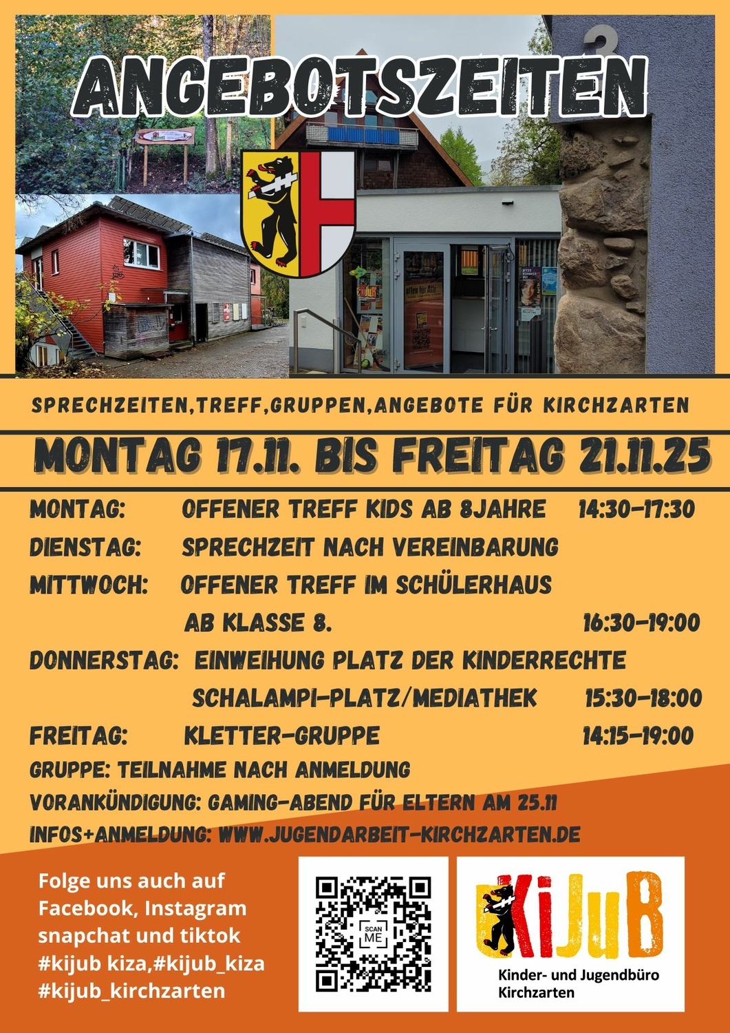 Auf dem Bild siehst du unsere aktuellen Angebotszeiten!Je nach Angebot findest du uns in der Talvogteistraße 3 , dem Schülerhaus oder im Giersbergarten